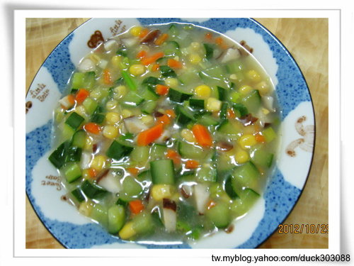 材料: 小黃瓜 1條,紅蘿蔔 4片(切丁),鮮香菇 5朵,玉米粒(罐頭) 4匙,蔥2支(切花),太白粉水