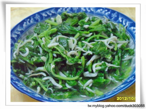 材料: 蒜頭 2粒,吻仔魚(醬油碟)半~1碟,白莧菜 1把