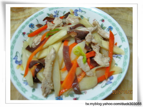 材料: 茭白筍 3支 ,木耳 1大片,蔥 1支,紅蘿蔔片 少許,雞胸肉 少許