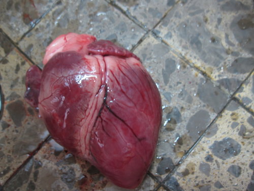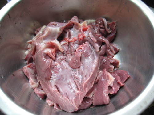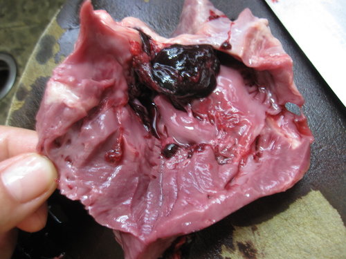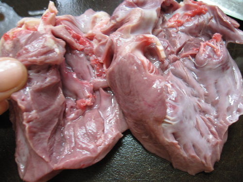 2. 從豬心凹槽處再用刀子劃開,並去除血塊(清乾淨一點)
