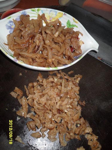 1. 菜脯用水泡約10分鐘,將水倒掉,用手將菜脯擰乾,切成絲
