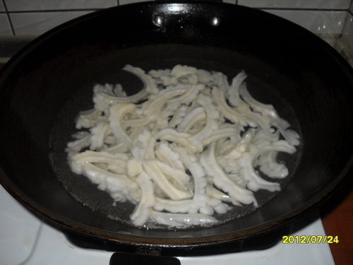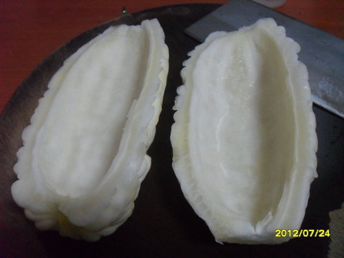 1. 苦瓜洗淨對半剖開,挖除子及白膜(挖乾淨一點較不會苦),再切成約0.5公分左右的長片