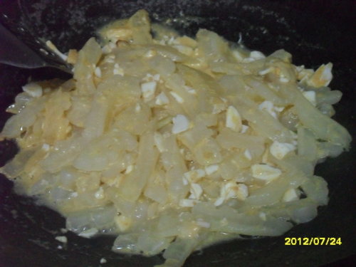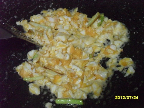 鍋中倒一大匙油放入切好的蛋丁和蔥白段炒至冒泡