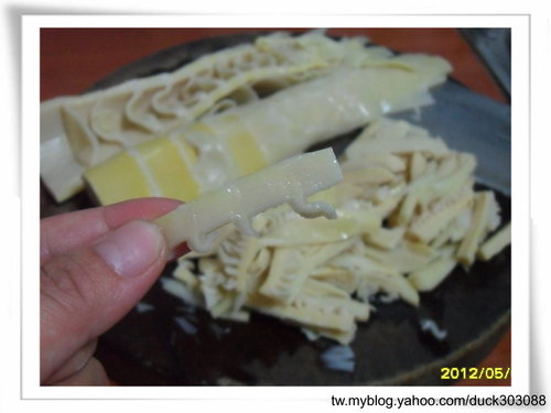 1. 桂竹筍先切成長5公分的段,再切成絲(因為筍子巳煮熟so順著紋路切,若逆紋切炒時會變碎)