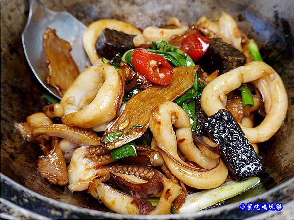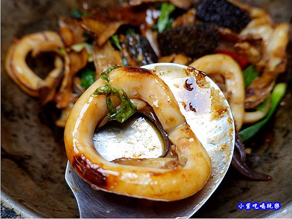 鍋內還有放米血糕,三杯醬汁被米血煸收後軟Q中帶著九塔香與三杯醬香