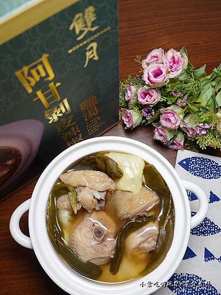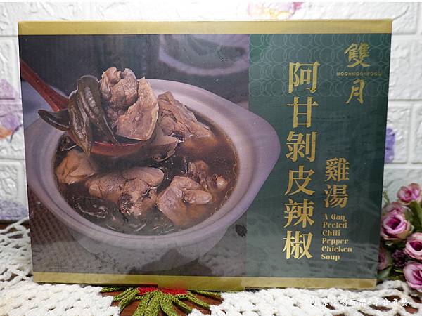 盒內有2包雙月秘製脆口剝皮辣椒及2包台灣溫體仿土雞腿肉+阿甘剝皮辣椒(採用湯肉分離煮法)經過燙肉燉煮至少8小時以上(冷凍)剝皮辣椒雞湯包