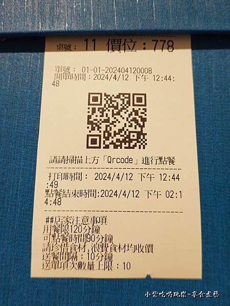 入座後點完鍋物湯頭! 服務生會key一張用餐『結束時間』烤串點餐QR Code