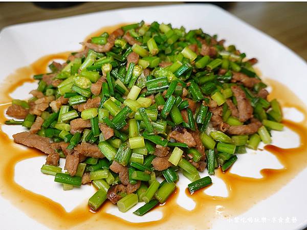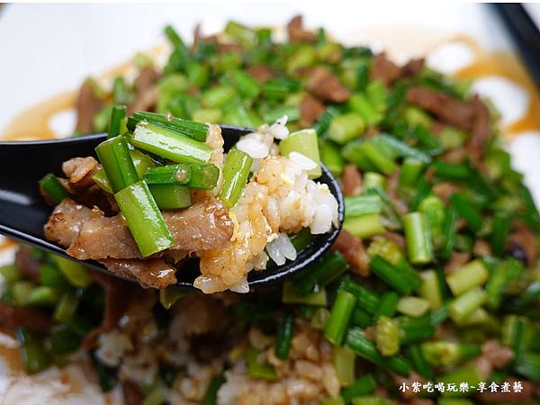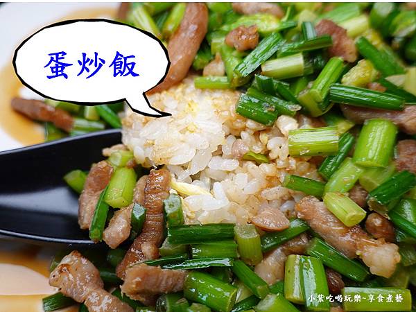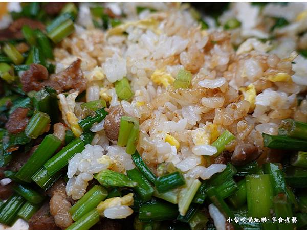 以蝦米、乾香菇絲爆香再放入刀工棒棒~幾乎與韭菜花同寛度豬五花肉絲一起煸炒再加醬油、糖調味! 每一條豬肉絲都吸飽飽醬香(軟嫩不乾柴)也不會有肥膩感!最後再加切細韭菜花一同拌炒調味(舖蓋在蛋炒飯)上方的客家烙飯! 灰熊古早味!