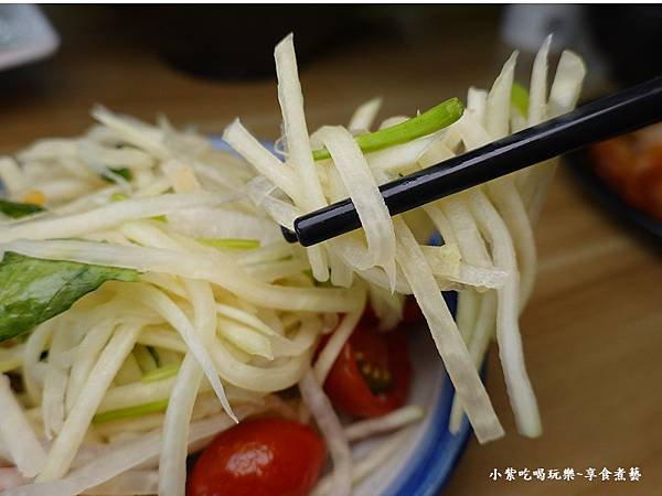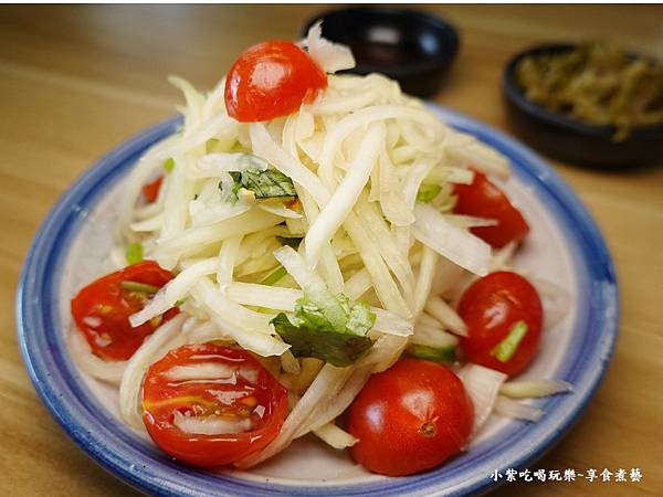 入口有著泰式涼拌木瓜酸酸甜甜滋味(無辣~不會辣)! 夾帶著香菜與聖女番茄果香~酸V開胃!