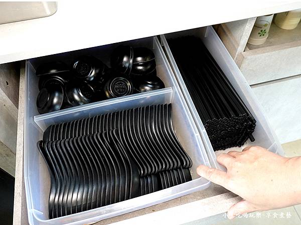 餐具(湯匙/筷子/醬料碟)均放在飲品自助吧下方抽屜內~自取