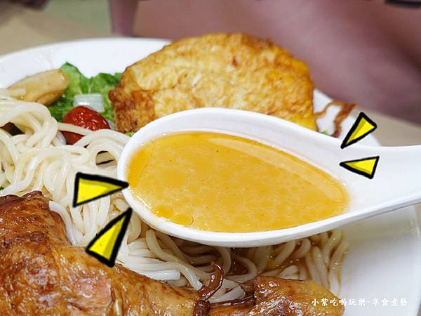 麻油炸蛋先泡在麵湯內一下下;讓蛋吸附麻油湯再吃! 好補~給人一種正在做月子的錯覺(哈哈) 湯韻很可以