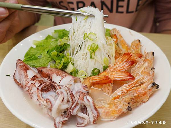 這碗米粉湯入口帶著薑絲香氣與煮過海鮮後之鮮甜味。湯色(微微乳白色澤)應該是店家+熬煮的大骨湯頭煮海鮮後呈現的顏色吧?!
