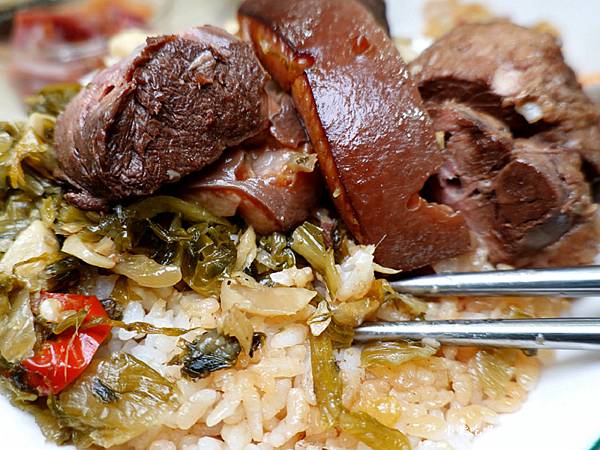 忘了詢問店員: 總之豬皮肥而不膩(軟Q軟Q) 瘦肉部位不會硬!有滷透! 一口爌肉+一口淋了滷汁白飯再配一口炒酸菜(正港ㄟ古早味)