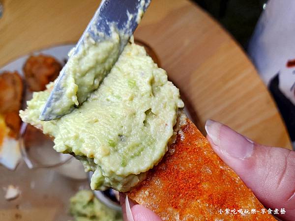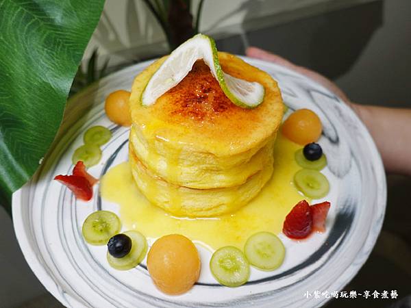 別忘了先將切小塊(厚鬆餅)沾佐盤內微微酸甜滋味『青檸蛋黃醬』