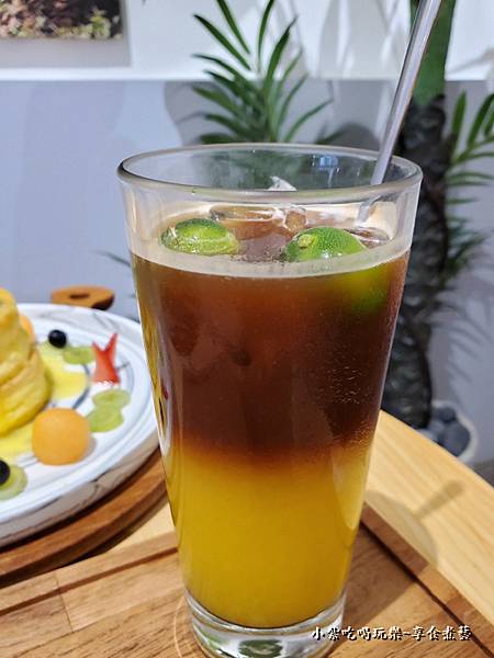 以新鮮金桔汁+蜂蜜搭配義式濃縮咖啡調製的水果風味冰咖啡(須先攪拌均勻後)再飲用;入口帶著金桔果酸與回甘咖啡香尾韻酸中帶甜~很順口(不會苦)